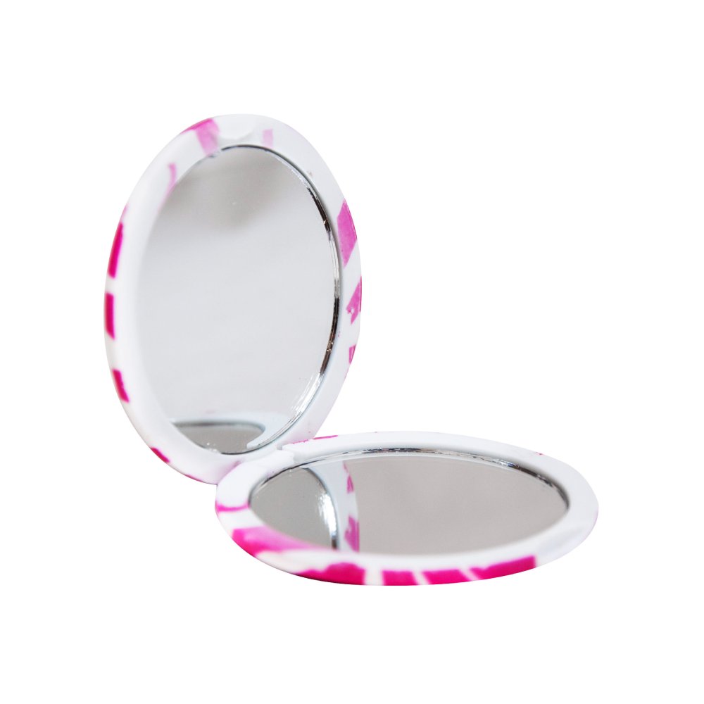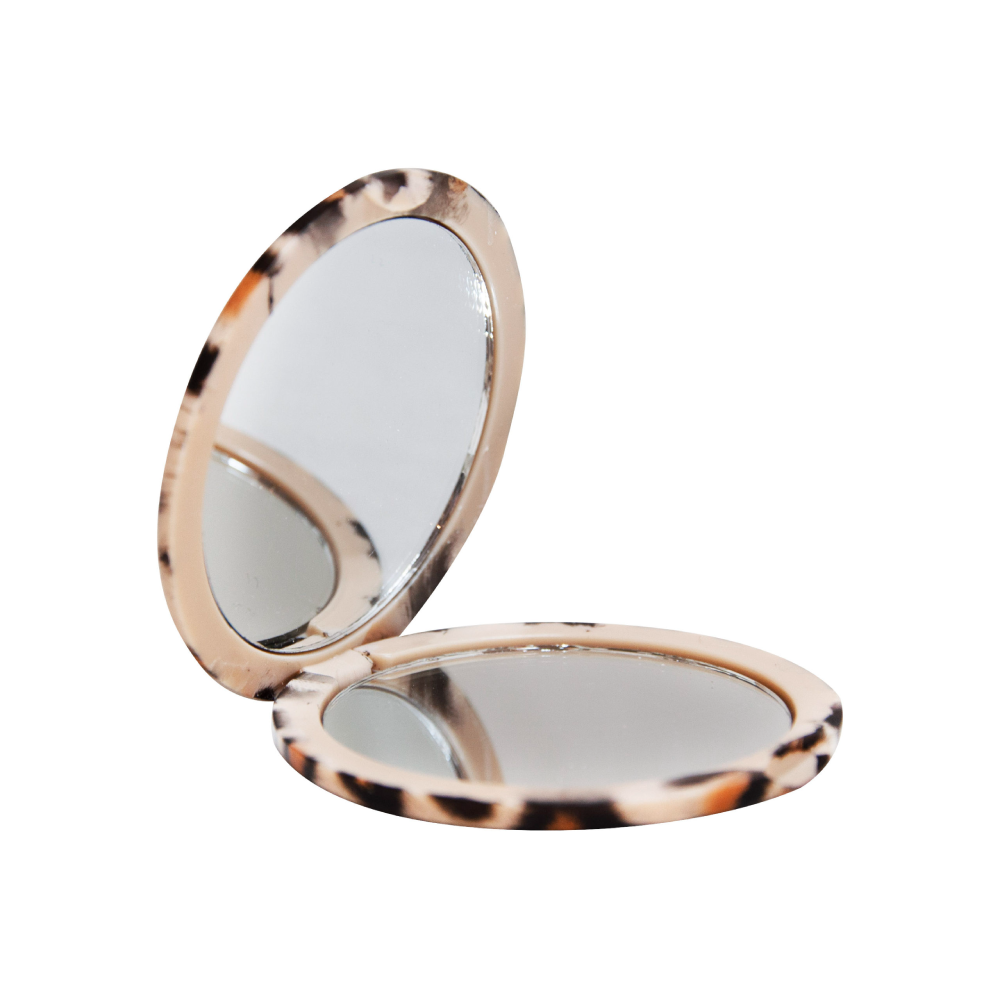 Espejo para cartera animal print con doble espejo, elegante y compacto de color rosa y marron, apto para cualquier ocasión. Con sus medidas del espejo interno 5,5 cm.
