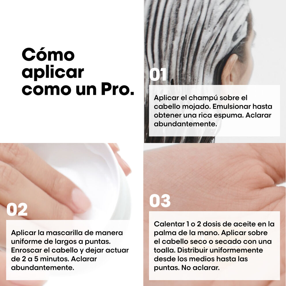 - Resultados visibles desde el primer uso: brillo, suavidad y nutrición profunda.