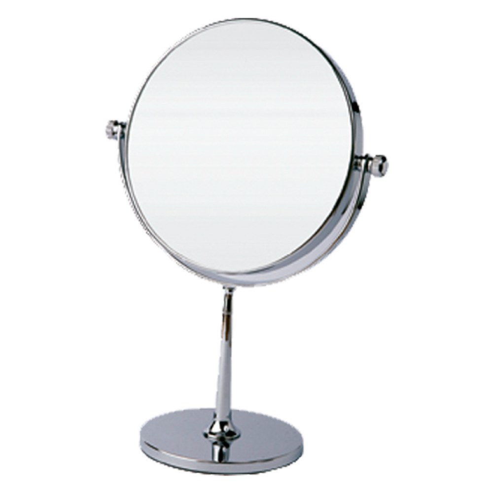 Espejo de pie, de formato redondo, su material es metal .Tiene aumento de 5X.