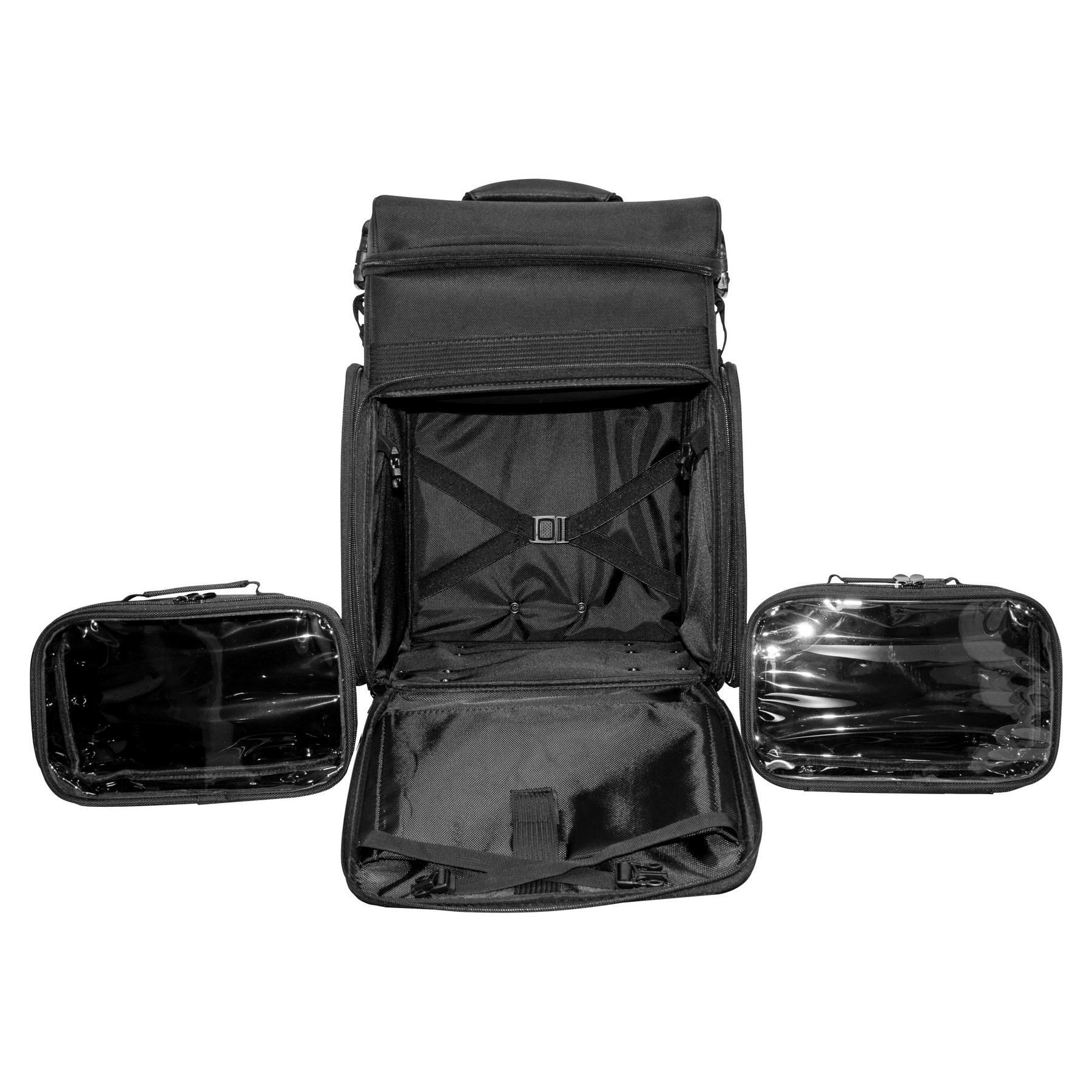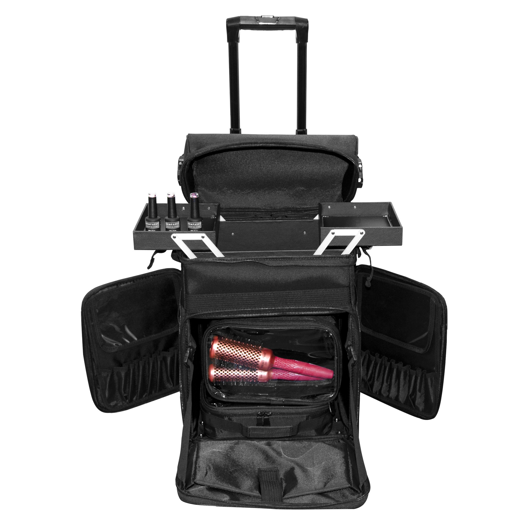 El maletín multiuso premium negro de Jessamy combina practicidad y elegancia en un diseño robusto y funcional. Incorpora compartimentos internos con bolsas transparentes extraíbles y organizadores para mantener todo en orden. Su sistema de bandejas desplegables y múltiples bolsillos facilita el acceso rápido a los accesorios. Además, sus ruedas giratorias y manija extensible lo convierten en el compañero perfecto para viajes o trabajo diario.