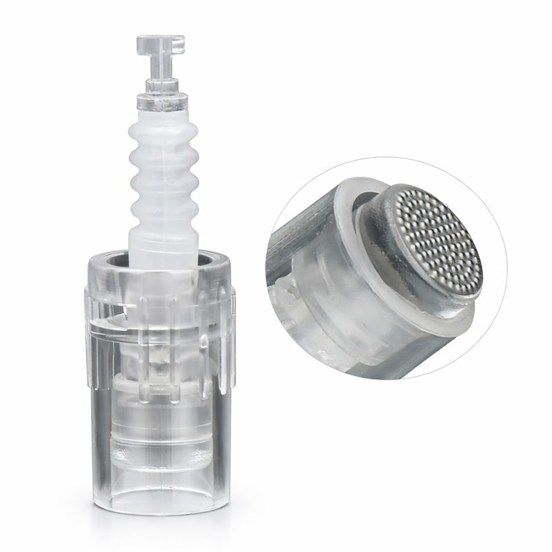 CABEZAL NANO ESTÉRIL DE BAYONETA PARA MICRONEEDLING Las agujas nano solo penetran el nivel de la superficie de la piel, evitando las capas más profundas como la dermis que se encuentra debajo. Los cabezales nano destacan por crear pequeños canales en la piel que aumentan la absorción del producto, lo que funciona bien en combinación con productos como sueros para el cuidado de la piel, cremas antienvejecimiento y lociones humectantes. Las nanoagujas también pueden funcionar para corregir el tono desigual de la piel o la hiperpigmentación
