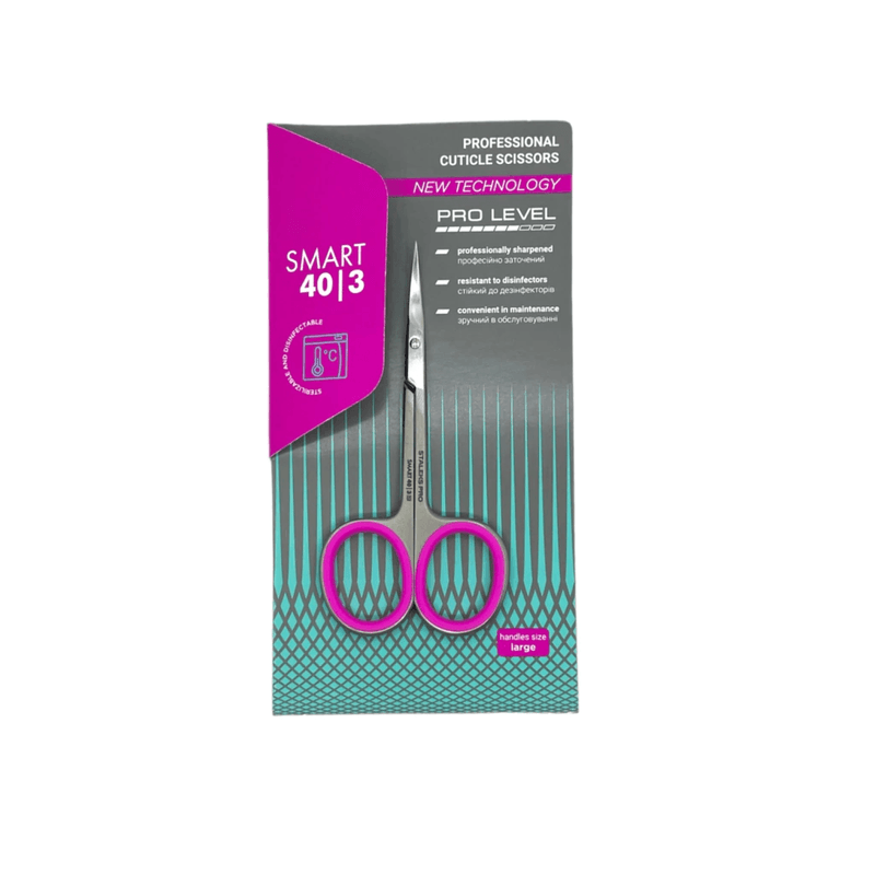 Tijeras profesionales STALEKS PRO línea SMART en acero inoxidable de alta aleación. Superficie satinada con acabado mate en mangos que reduce reflejos y tensión visual. La característica distintiva es la incorporación de insertos de silicona en los anillos que absorben presión y evitan fricción durante jornadas laborales extensas. Compatible con esterilización en autoclave y calor seco (removiendo los insertos de silicona previamente). Ideal para manicuristas y pedicuristas que priorizan confort máximo en herramientas de precisión profesional. TÉCNICA DE USO Sostener las tijeras con los mangos elongados bien acunados en la mano, apoyando los dedos en los anillos con insertos de silicona. Posicionar las cuchillas biseladas bajo la cutícula, paralelas a la lámina ungueal. Realizar cortes pequeños y controlados, dejando que el ángulo biselado y el trazo suave hagan el trabajo. Avanzar lentamente alrededor de toda la uña. Antes de esterilizar, remover cuidadosamente los insertos de silicona, esterilizar por separado, y reinsertar antes de usar.